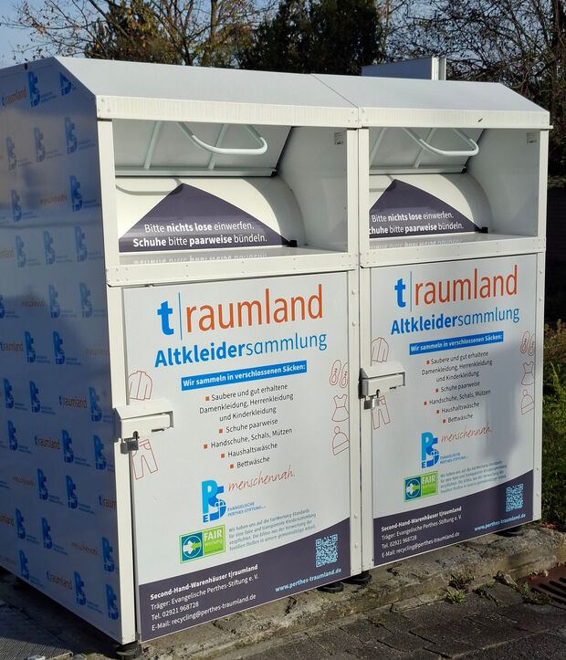 Die Förderung erfolgte im Rahmen der Kollekte der Evangelischen Kirche von Westfalen. Das Aufstellen von Altkleidercontainern beinhaltet eine neue Angebotsstruktur für die tIraumländer: Unser Ziel ist es, den Teilnehmenden von arbeitsmarktpolitischen Programmen weiterhin das Aufgabenfeld „Wiederverwendung von Kleidung“ anbieten zu können.